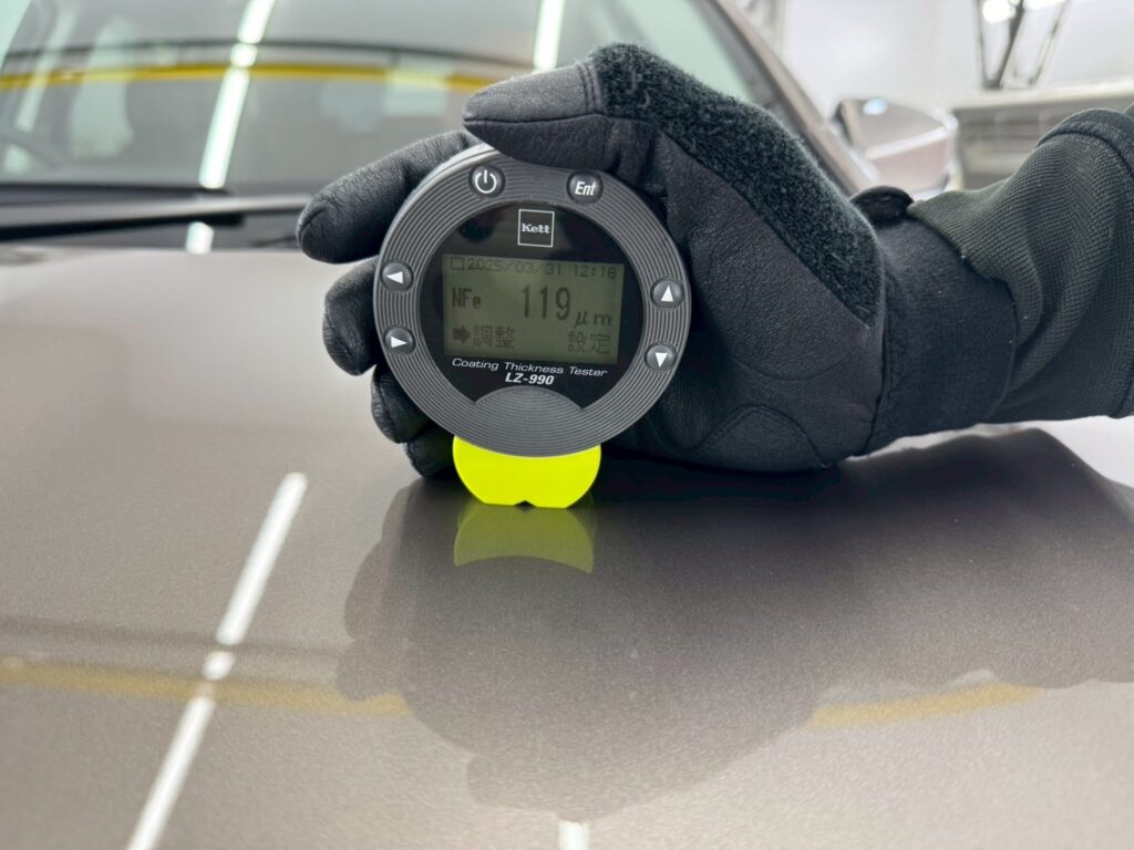 限りある塗装を必要以上に磨きすぎる事がないように、ボディ全体の塗装の厚みを計測いたします。