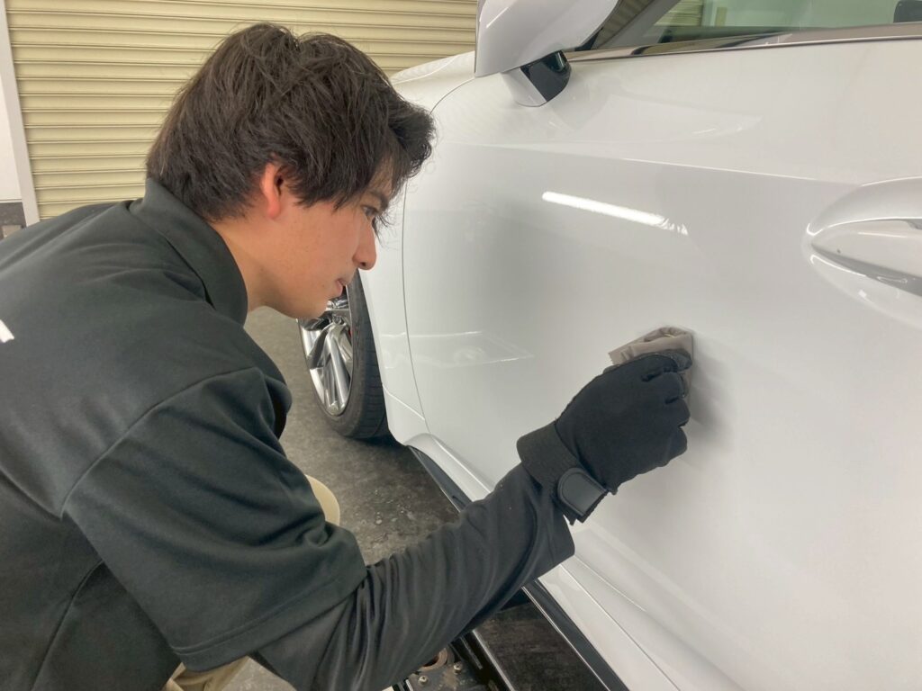 ボディ磨きで美しく仕上げたら、ご用命いただいたボディコーティングを丁寧に塗り込み、さらに艶々なボディに仕上げます。端から端まで、丁寧にコーティング被膜を塗りこみます。