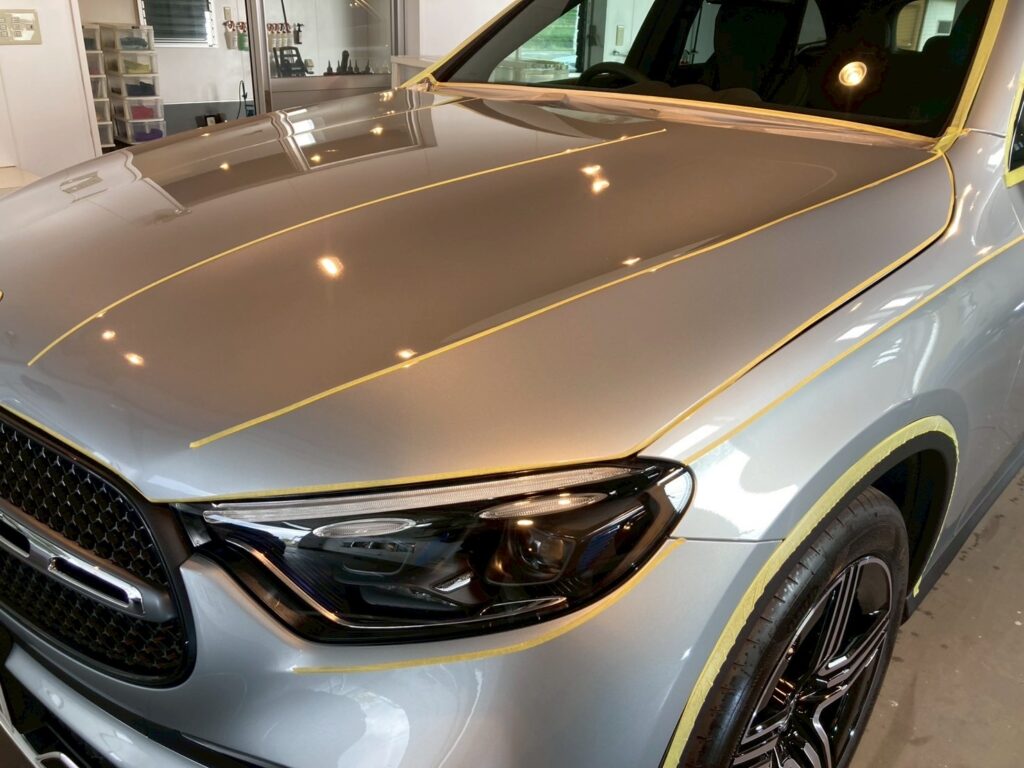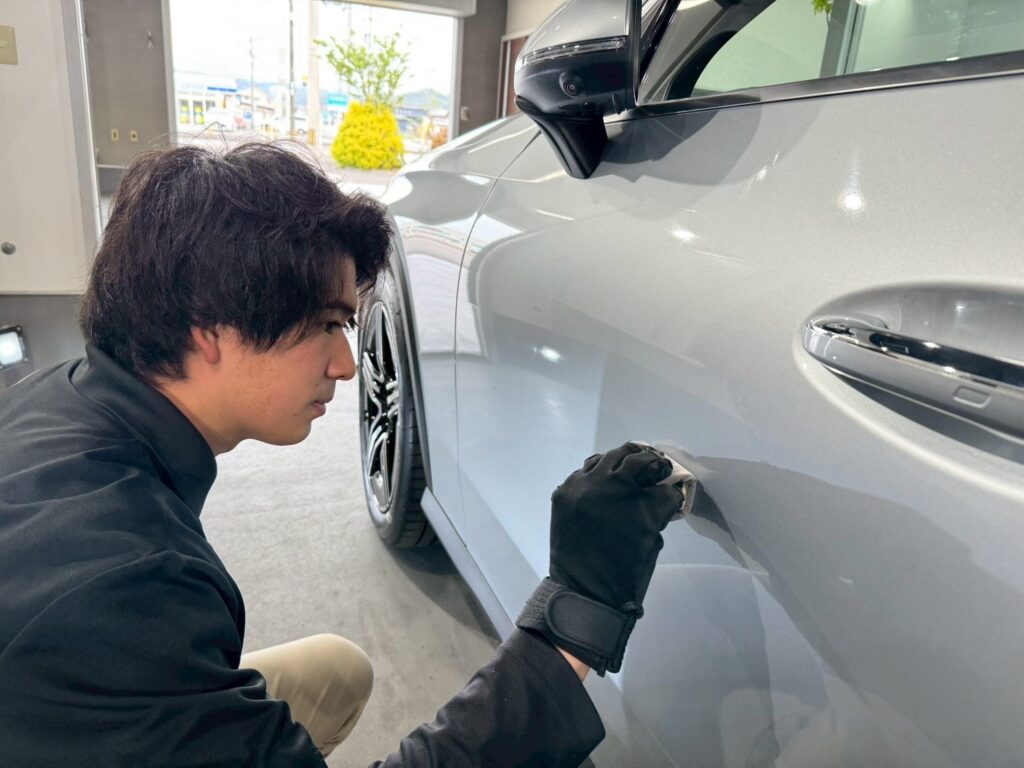 新車のため、状態は良好ですが、細かな水アカなどをしっかりと洗浄し、見た目にもスッキリと!水アカや汚れをキレイに落としたあとは、塗装の状態をチェックします。