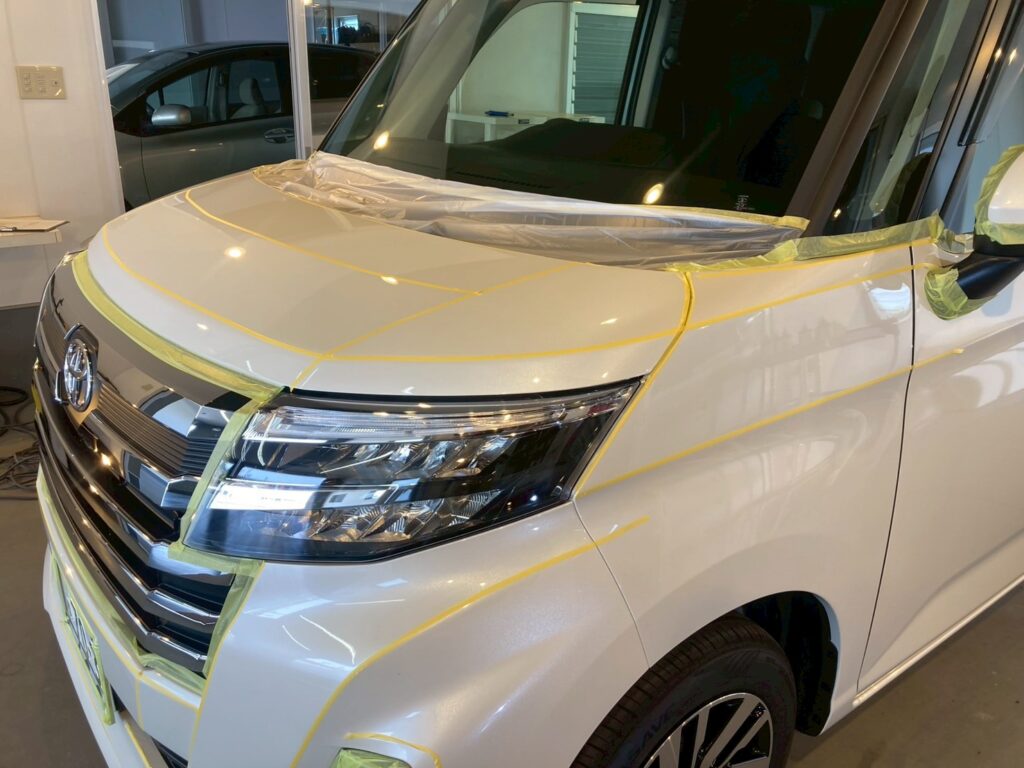塗装の状態を確認したら、マスキングテープでゴム部分などの磨けない部分の養生しっかりと行います。