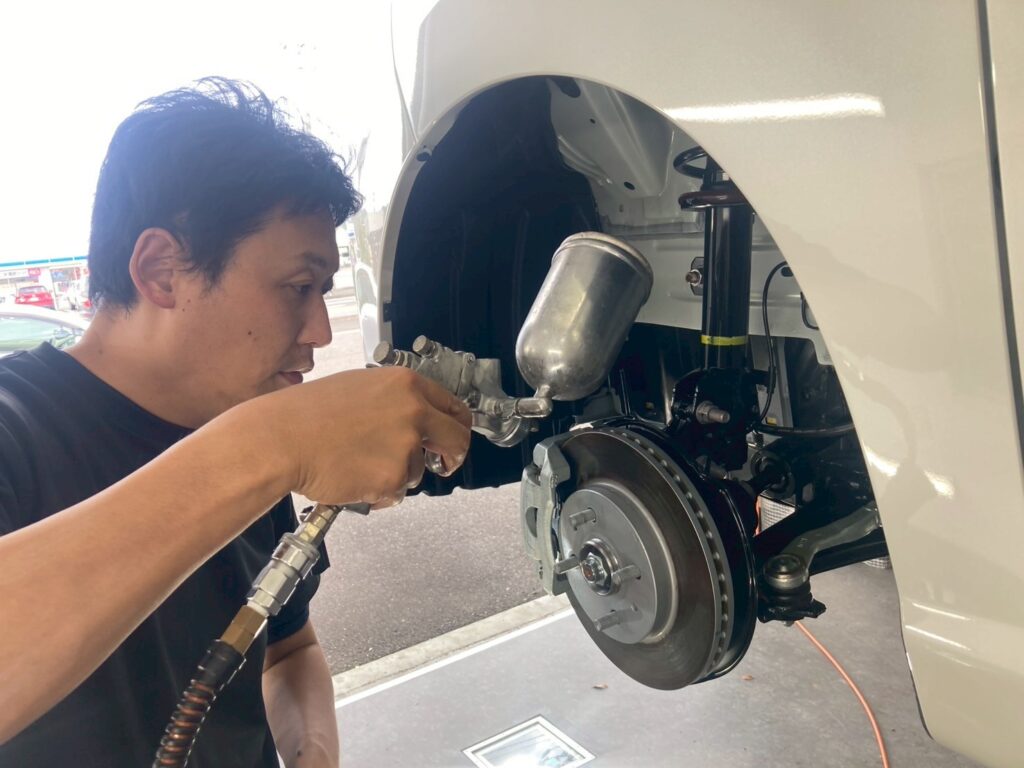 見えにくい部分もリフトで持ち上げ、徹底洗浄!そして、今回はアンダーコーティングもご用命頂いております。防サビ・防汚に優れたこだわりの下周り専用のコーティングでご愛車の下周りを強力にお守りいたします
