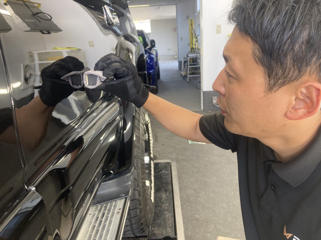 ボディの養生の後は、プロの技でボディ全体を美しく磨き上げ、車本来のツヤを最大限に引き出します。