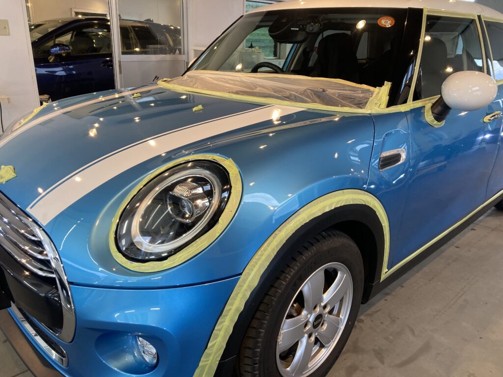 状態を確認したらマスキングテープでボディを養生を行います。ゴムや樹脂パーツなど、磨きが出来ない部分をしっかりと養生します。