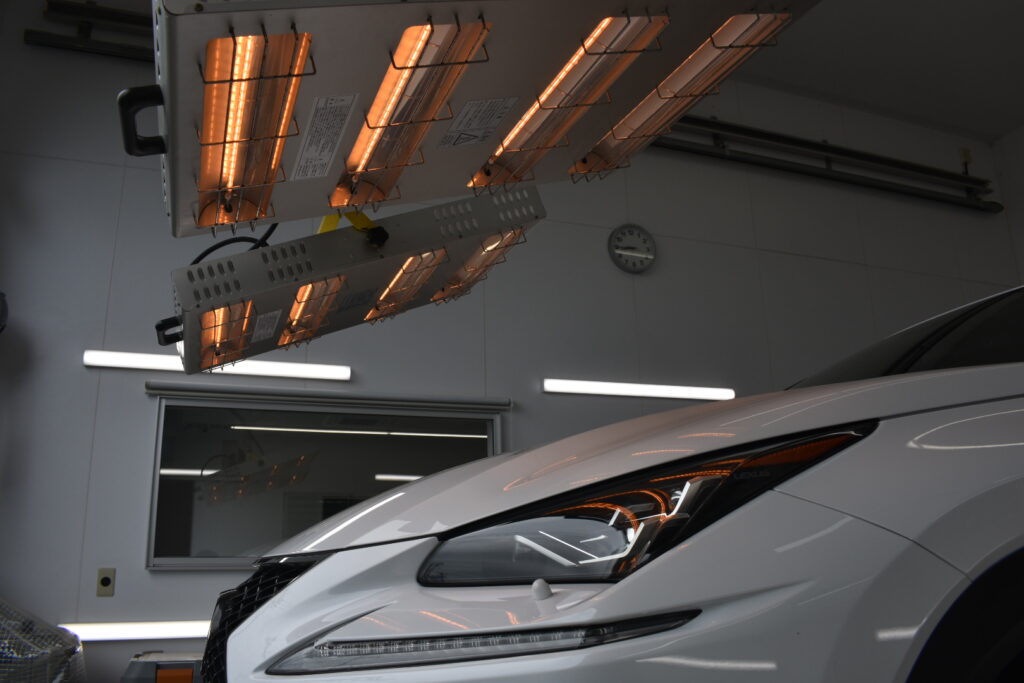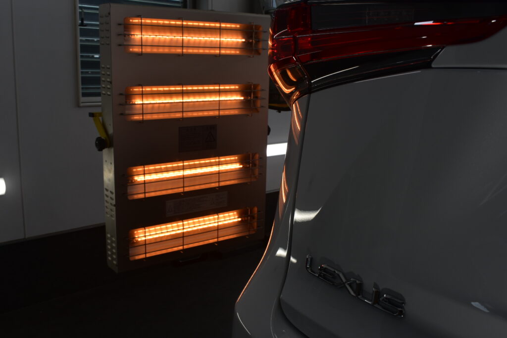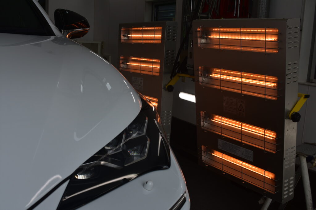 コーティング剤を端から端まで丁寧に塗り込み、赤外線ヒーターで熱を加えて焼き付けていきます。