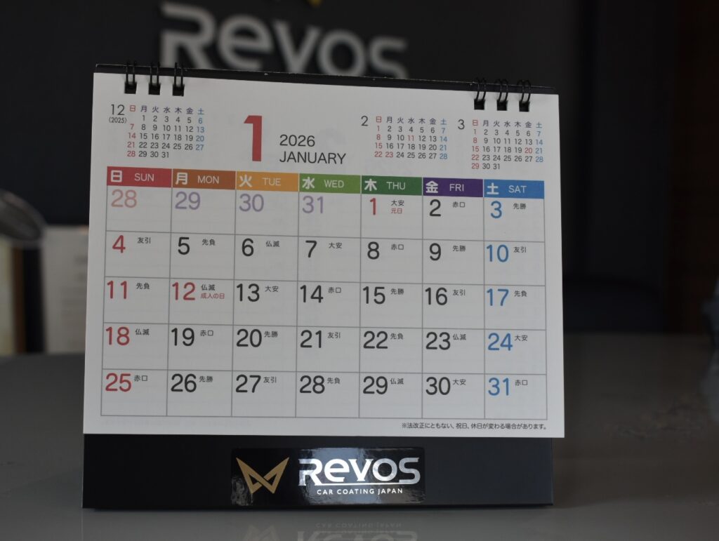 さらに!!只今、カーコーティングやメンテナンスをご依頼でRevoSロゴ入り卓上カレンダーをプレゼント!!