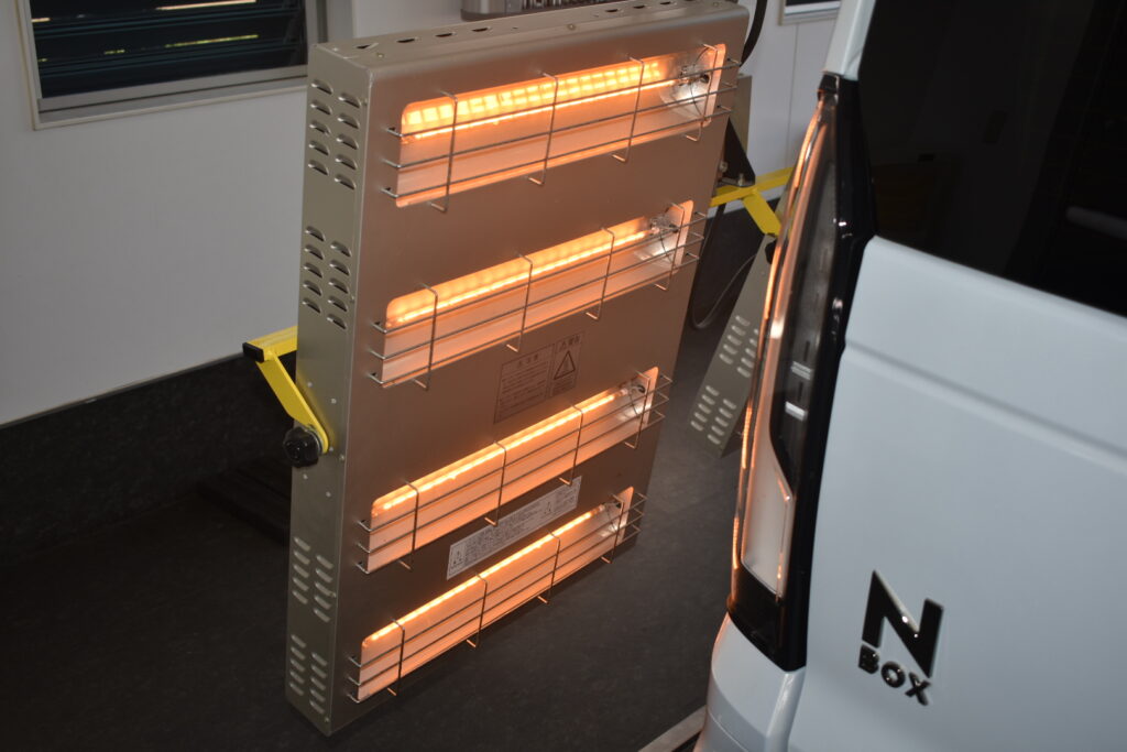 コーティング被膜を塗りこんだ後は、赤外線ヒーターで熱を加え、焼き付けていきます。