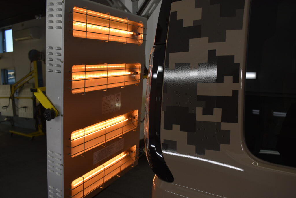 コーティング被膜を塗りこんだ後は、赤外線ヒーターで熱を加え、焼き付けていきます。