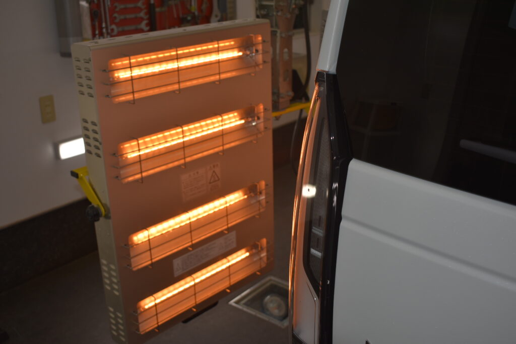 コーティング被膜を塗りこんだ後は、赤外線ヒーターで熱を加え、焼き付けていきます。