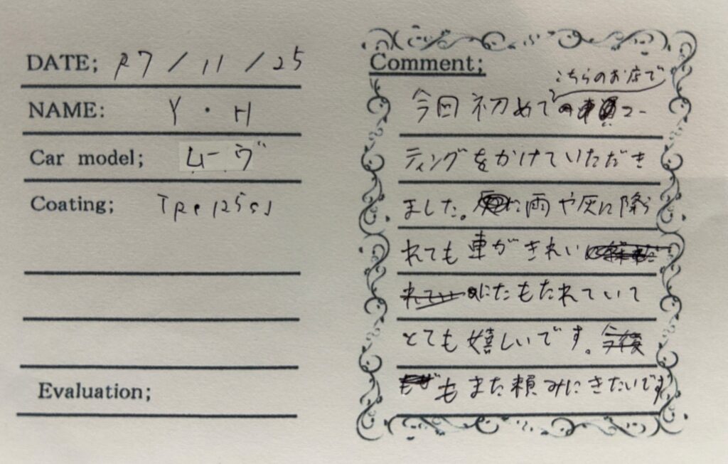 今回、初めてこちらのお店でコーティングをかけていたただきました。